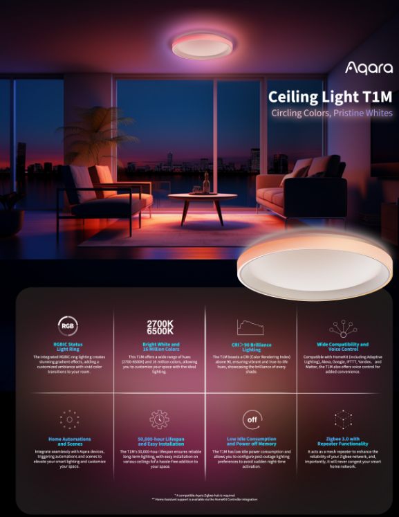Smart Home Integration – Works with Aqara Home, Apple HomeKit (Adaptive Lighting), Google Home, Alexa, SmartThings, IFTTT, and Matter (via Aqara Zigbee Hub).